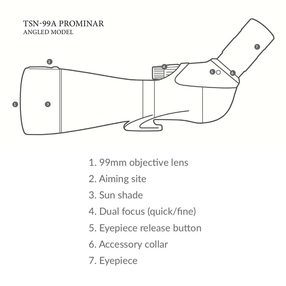 Set includes both the angled body and 30-70x zoom eyepiece. This scope's 99mm Prominar objective lens is made of natural fluorite crystal.