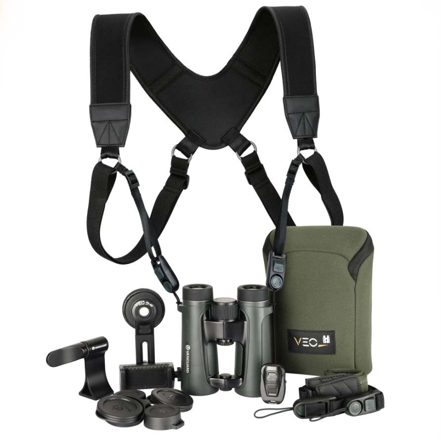 You get the VEO HD IV binoculars, VEO Optic Guard deluxe harness, BA-185 adapter to mount your binoculars to a tripod, and VEO PA-62 digiscoping kit to help you capture smartphone video and photos of your subject. It's a perfect match for birders, outdoor adventurers, and nature lovers.