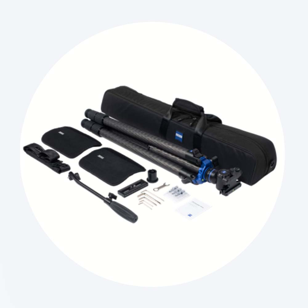 The new Zeiss Universal Tripod Kit is a new, premium tripod-and-head kit with exceptional stability, at a surprisingly moderate price. The Universal Kit features 3/8-inch thread-on fluid head with extendable handle. Extended twist-lock system with 3-section carbon fiber legs (36/32/28 mm dia.)